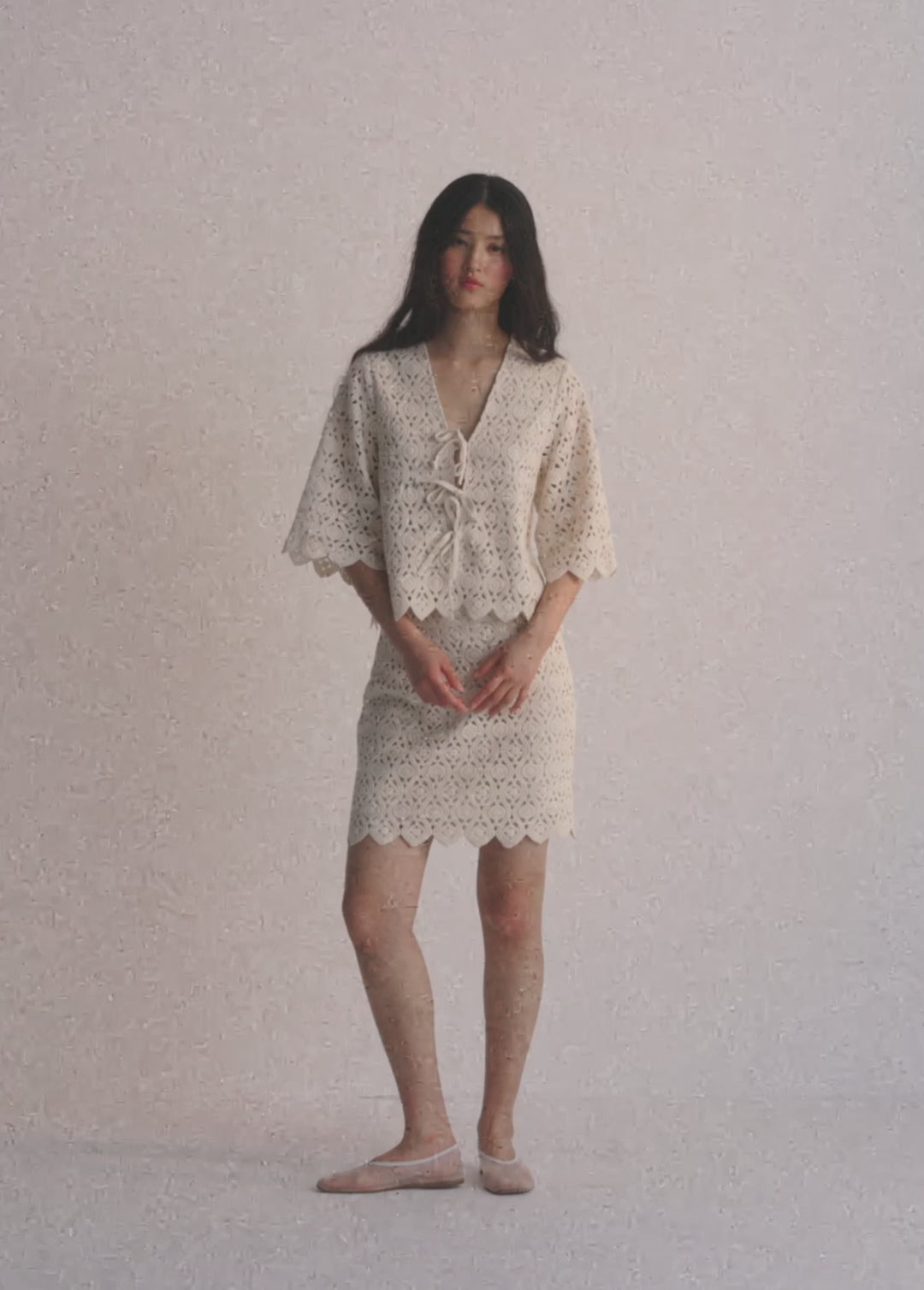 Crochet skirt with inner lining and side slit with invisible zipper. Perfect for creating a coordinated look with the matching top. Spring Summer Collection. The New Society.