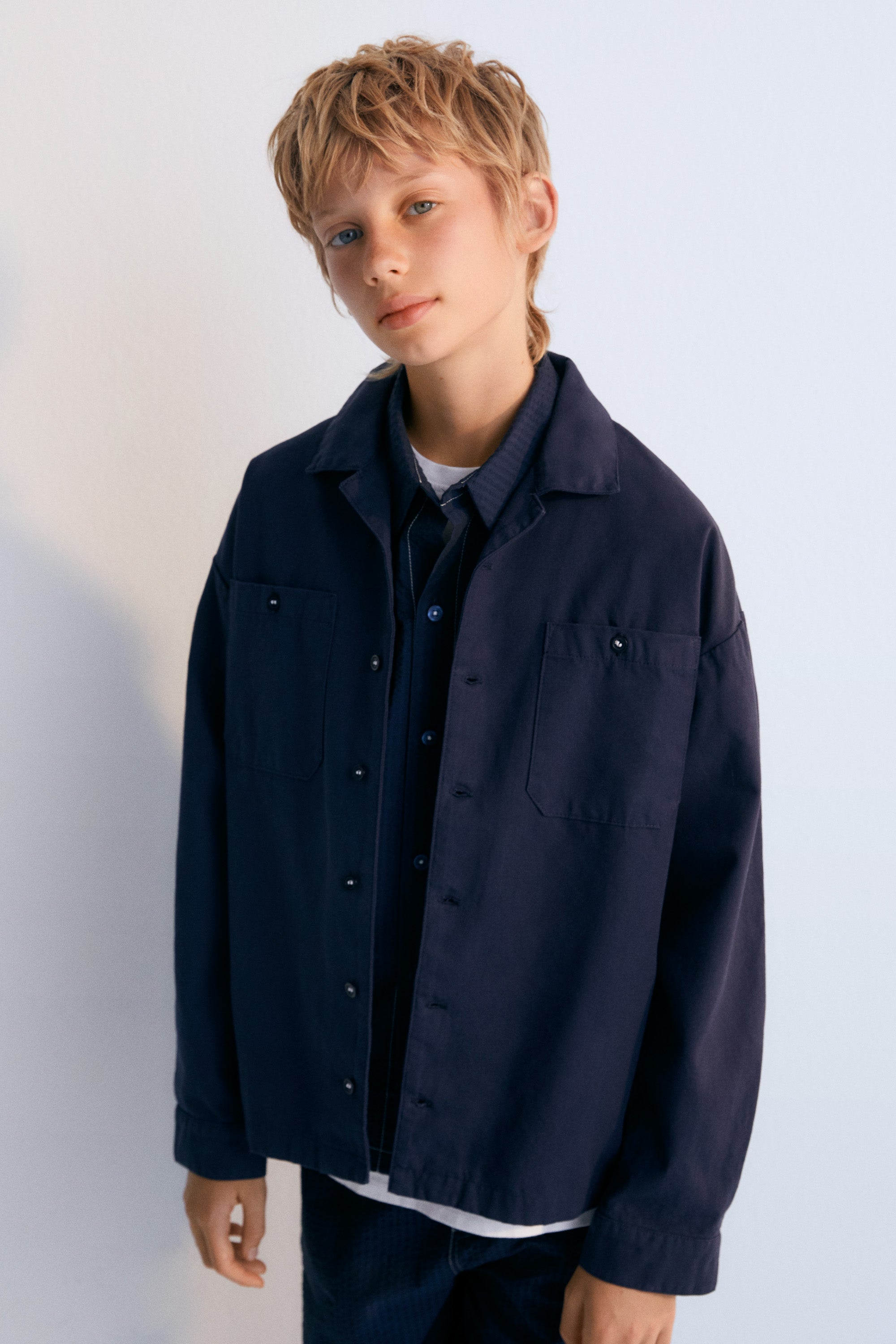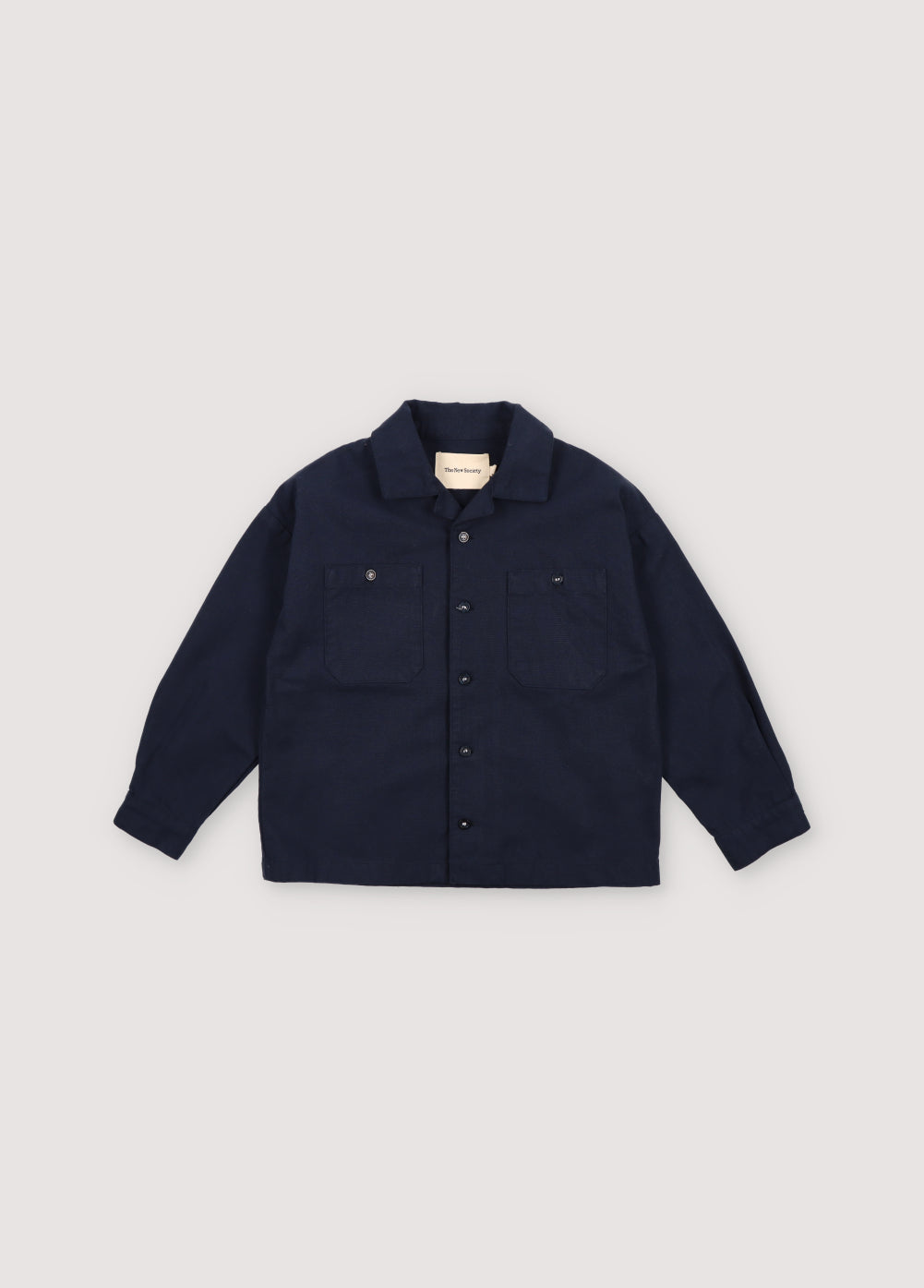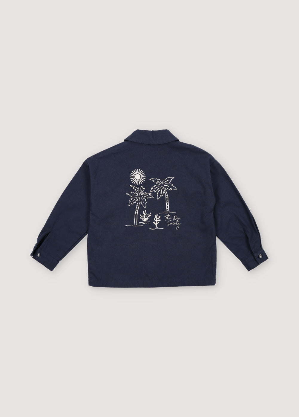 Rodas Overshirt crafted from 100% cotton canvas fabric in a rich navy color, featuring a collection embroidery on the back. The design is completed with white palms embroidered on the back, adding a touch of tropical charm. This versatile overshirt combines style and comfort, perfect for layering over casual outfits or adding a statement to your look.